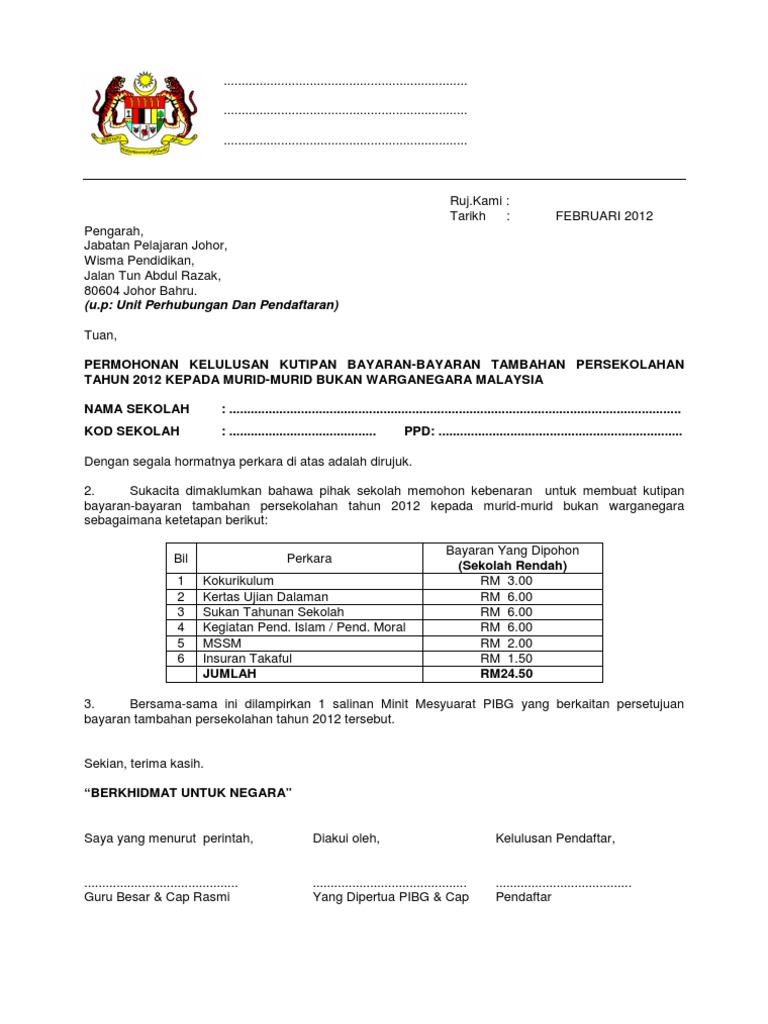9 september 2014 kepada, pengerusi pibg, sekolah kebangsaan sinar jaya, johor bahru, jkr 5793 jalan pahlawan 17, taman ungku tun aminah, 81300 skudai, johor, malaysia. Surat rasmi memohon sumbangan kewangan rasmi l cute766. Oleh itu, pihak sekolah ingin memohon agar pihak persatuan ibu bapa dan guru (pibg) smk bugaya dapat memberikan sumbangan kewangan sebanyak rm 1500.00 demi kelancaran program. Kerjasama pihak tuan didahului dengan ucapan terima kasih. Guru besar, sekolah kebangsaan sri wangi,.